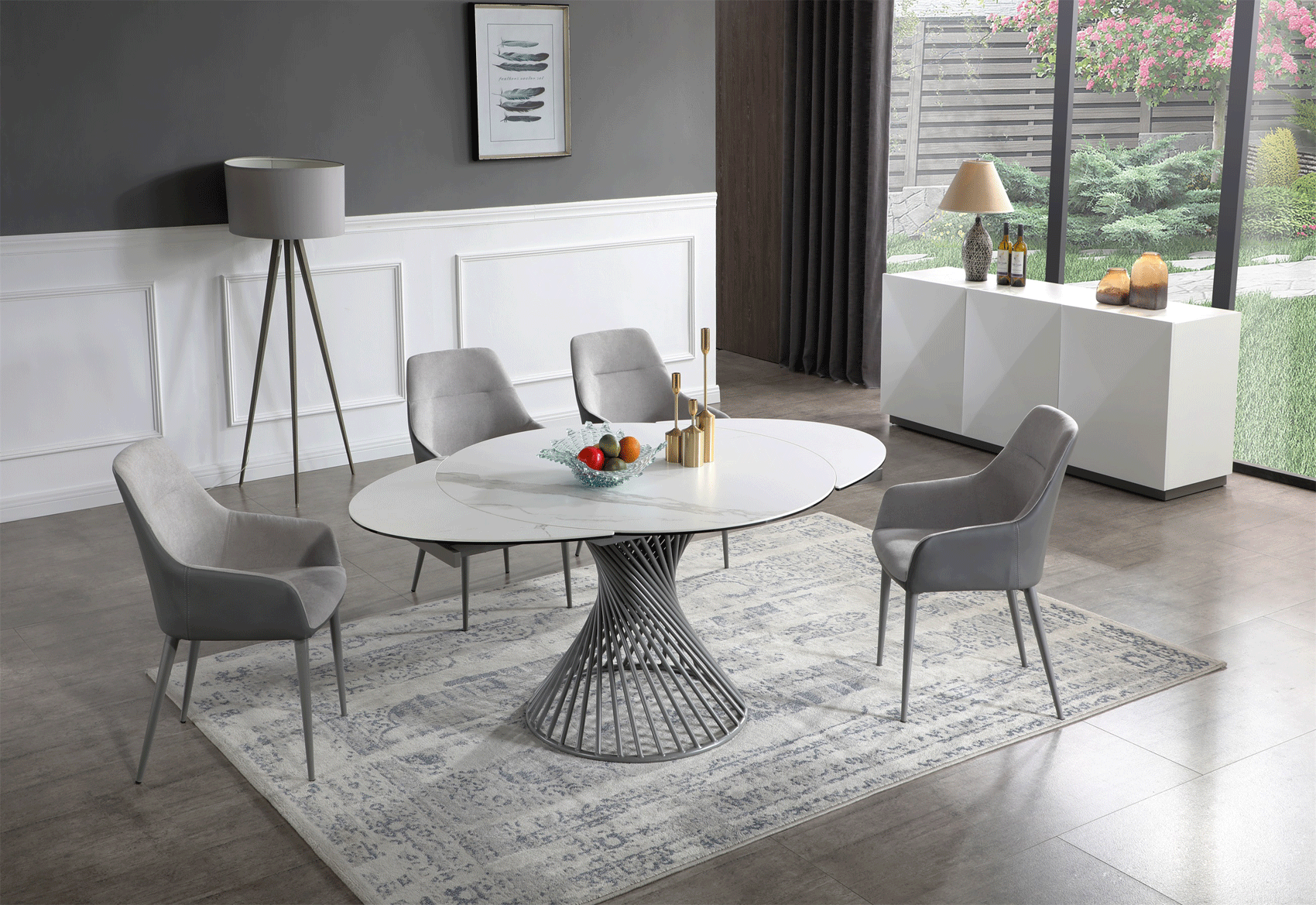 A unique set of furniture for the dining area. Durable wooden and metal construction combined with rich high gloss finish give this set its ultra-modern exterior while the white color of the set adds a touch of the elegance.